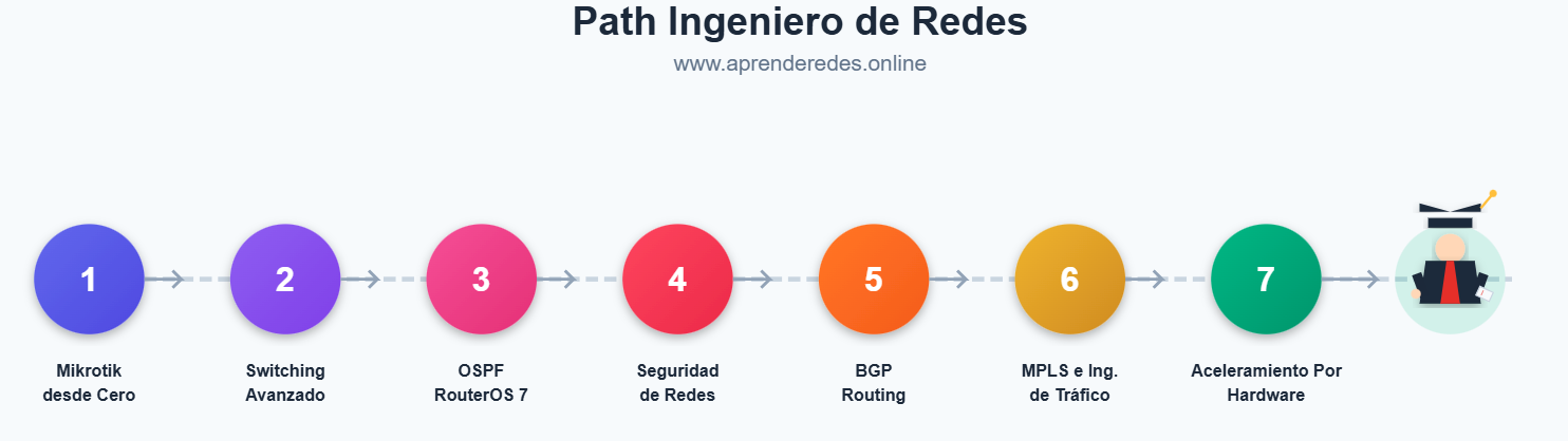 El Path Ingeniero de Redes se compone de siete etapas cuidadosamente organizadas. Cada una construye sobre los cimientos de la anterior, de modo que cuando llegues al final, tendrás una comprensión integral de las redes modernas: